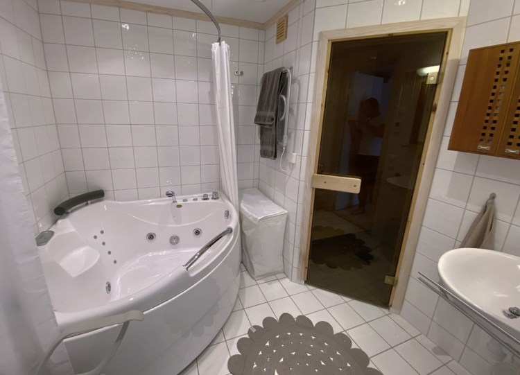 There are two bathrooms on the ground floor, both fully tiled and well-maintained. The larger one is equipped with an accessible toilet, towel warmer, jacuzzi, and sauna.