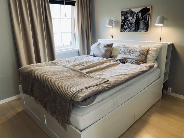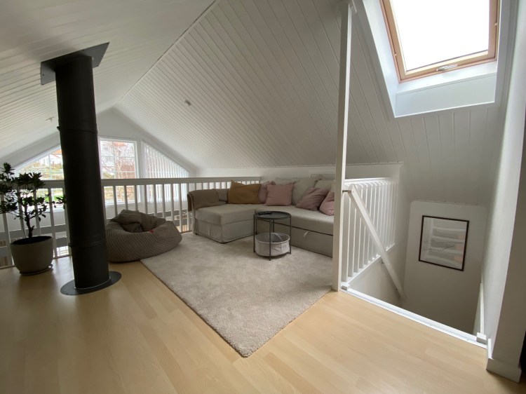The third bedroom is located upstairs. Here, there is a 180 cm wide Hilding continental bed from MIO. Clothing storage is available behind the curtain.